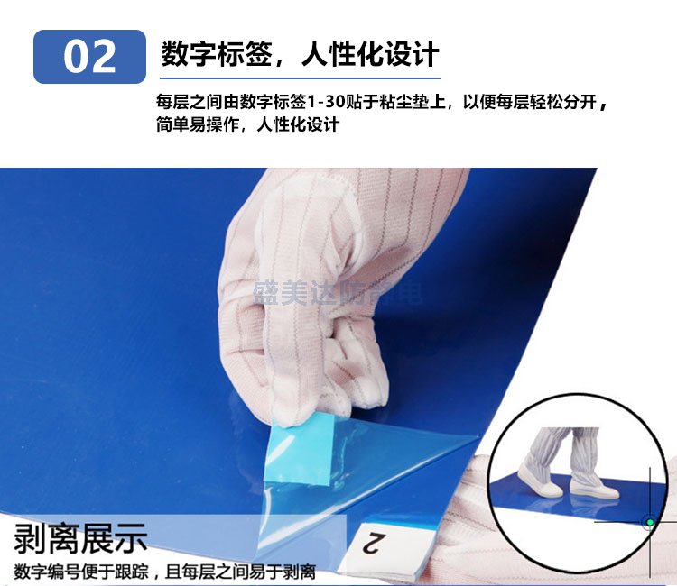 粘塵墊又稱粘塵地墊、粘塵地板膠,采用優(yōu)質(zhì)低密度聚乙烯材料和環(huán)保型壓敏水溶性粘合劑經(jīng)過(guò)特殊工藝復(fù)合而成,能使粘塵墊每層表面粘性均勻,不掉膠,無(wú)氣味,環(huán)保無(wú)毒,能快速有效清除運(yùn)輸工具車輪和鞋底攜帶的灰塵,保持環(huán)境清潔。粘塵墊有30層,每層之間左上角或者右上角都有1-30或者30-1的數(shù)字標(biāo)簽,以便于更換。主要應(yīng)用于微電子、半導(dǎo)體、生物制藥,醫(yī)療器械、食品加工和醫(yī)院等各行業(yè)。