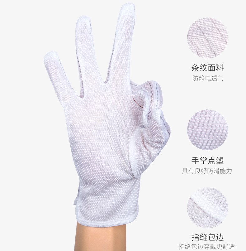 防靜電點塑手套又稱防靜電點塑防滑手套,是采用特種防靜電滌綸布制作而成,材質(zhì)由滌綸和導(dǎo)電纖維組成,導(dǎo)電纖維間距為10mm,手心加上PVC防滑顆粒,防滑性好、耐磨性好,手套具有極好的彈性和防靜電性能,能避免人體產(chǎn)生的靜電對產(chǎn)品造成破壞,適合在電子行業(yè)、半導(dǎo)體、醫(yī)療生物、光伏、光學(xué)及無塵車間使用。