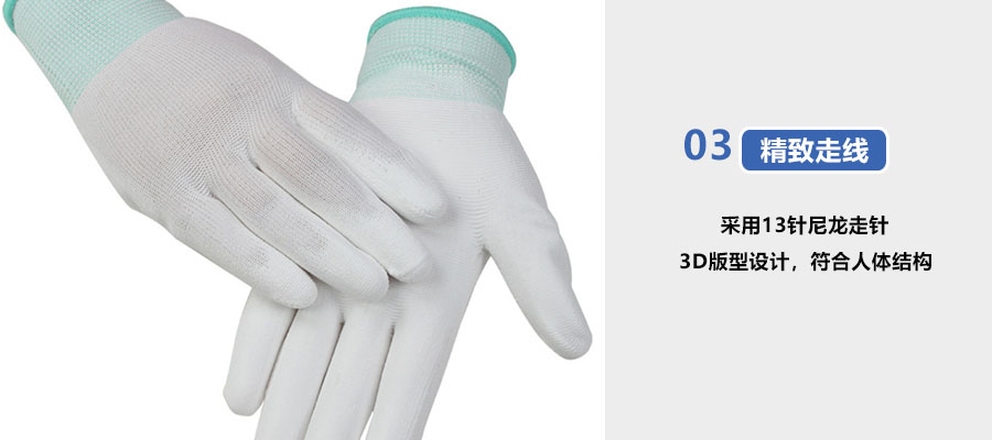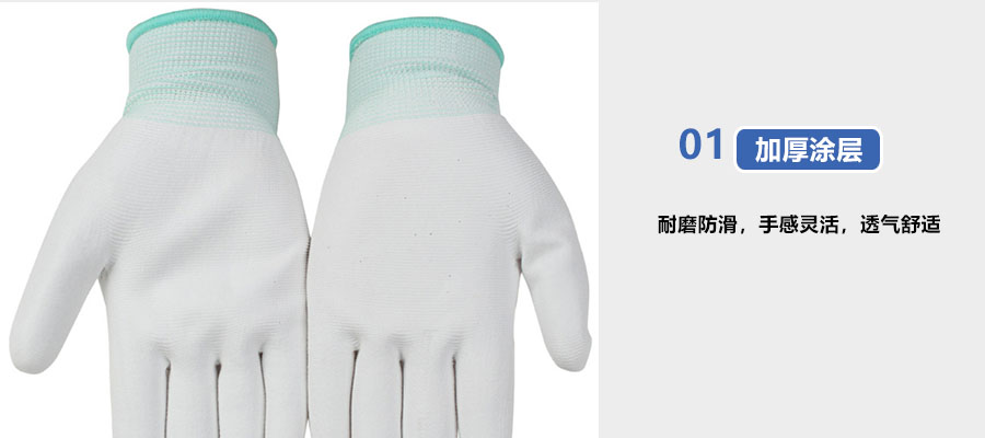 PU涂層手套又稱PU涂膠手套,根據(jù)涂膠的部位分為PU涂指手套、PU涂掌手套。其制作方法是在針織尼龍手套的手指或手掌部位涂上一層PU樹脂,這樣既增加了防滑性能,又增加了隔熱性能,同時能防止人體手掌的手汗和微粒污染,是精密電子生產(chǎn)線不可缺少的產(chǎn)品。可用于精工制造業(yè)、紡織業(yè)、電子行業(yè)、電力工程、汽車裝配、無塵車間等領(lǐng)域。